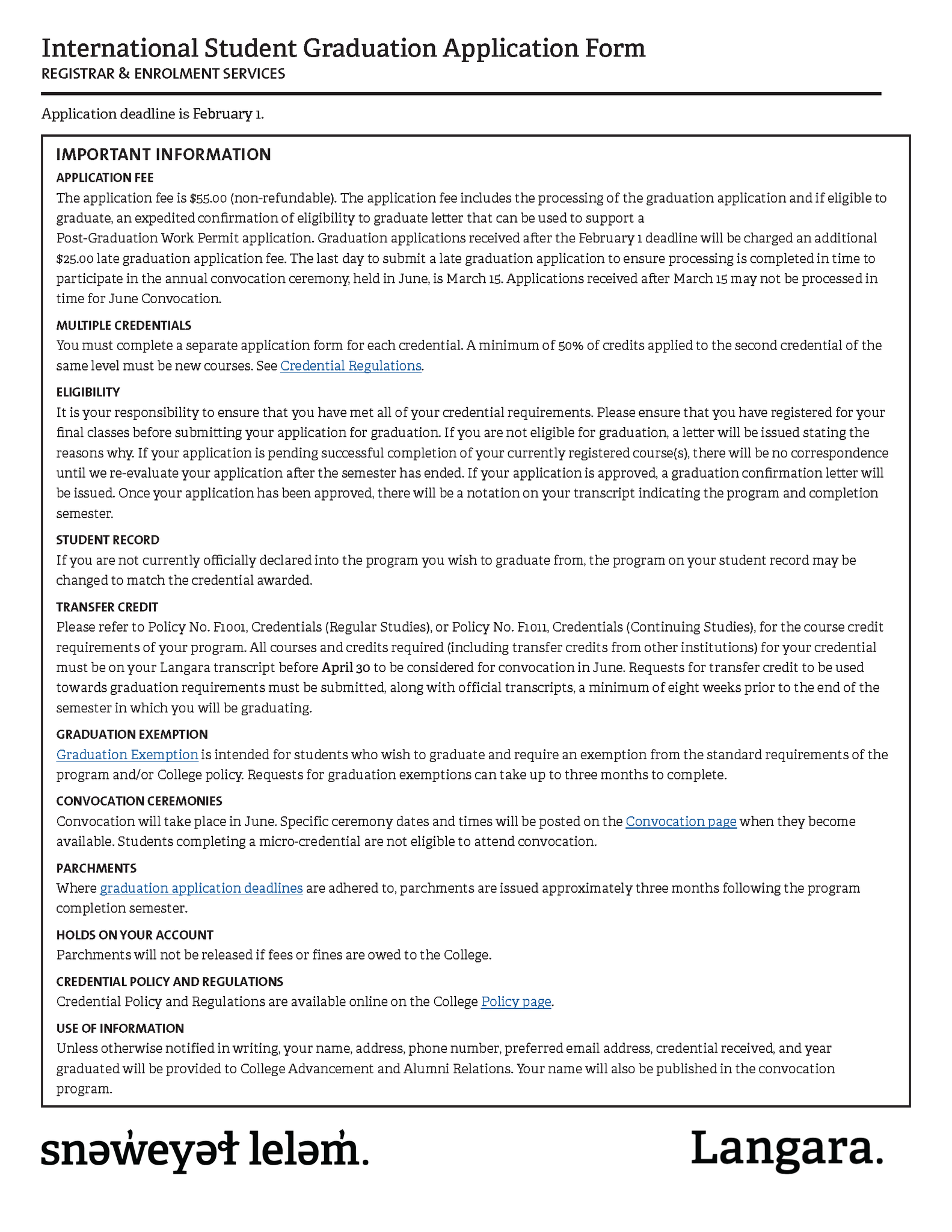 In order to receive a credential for their chosen program, all students must apply for graduation. Students are encouraged to apply for graduation during the semester in which they complete their program requirements, according to the posted Graduation Application Timelines. Upon successful completion of all graduation requirements, international students are prioritized to receive a confirmation of graduation letter by the 15th day following the end of the completion semester. This letter may be used in support of a post-graduation work permit application.
