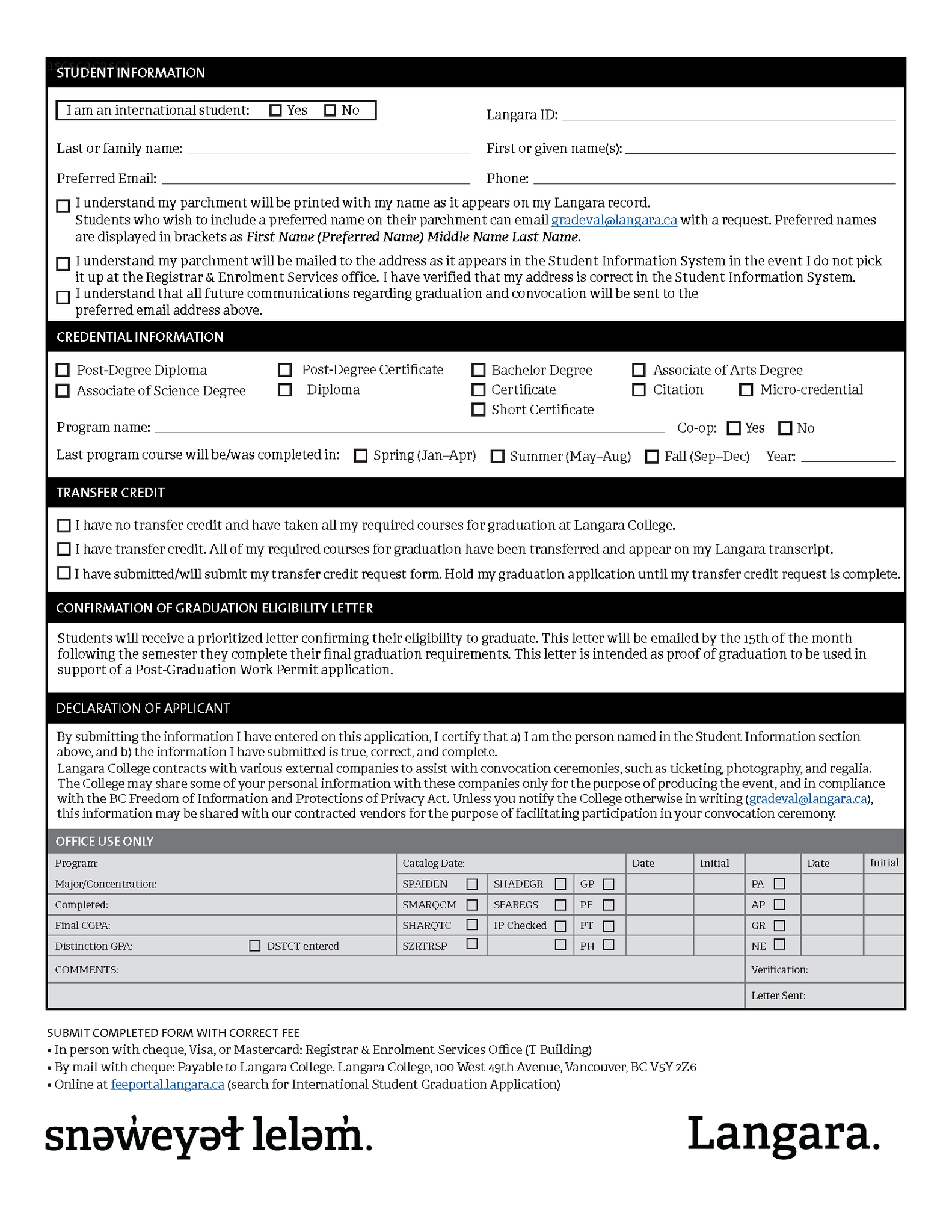To complete your order, please download and fill in the Graduation Application – International Students, form then upload a PDF or image of your completed form. Select your quantity (one unit per credential applied for) and pay for your purchase.